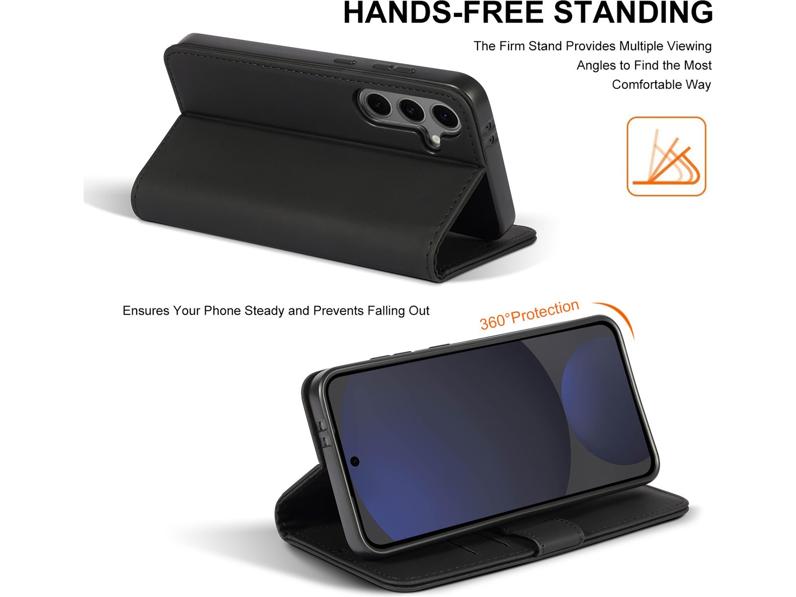 Fronten kan brettes til en praktisk stativfunksjon, perfekt for å se filmer, delta i videomøter eller scrolle komfortabelt uten å holde telefonen i hånden. Den lette konstruksjonen og myke overflaten gir et behagelig grep, samtidig som den bevarer telefonens slanke profil.