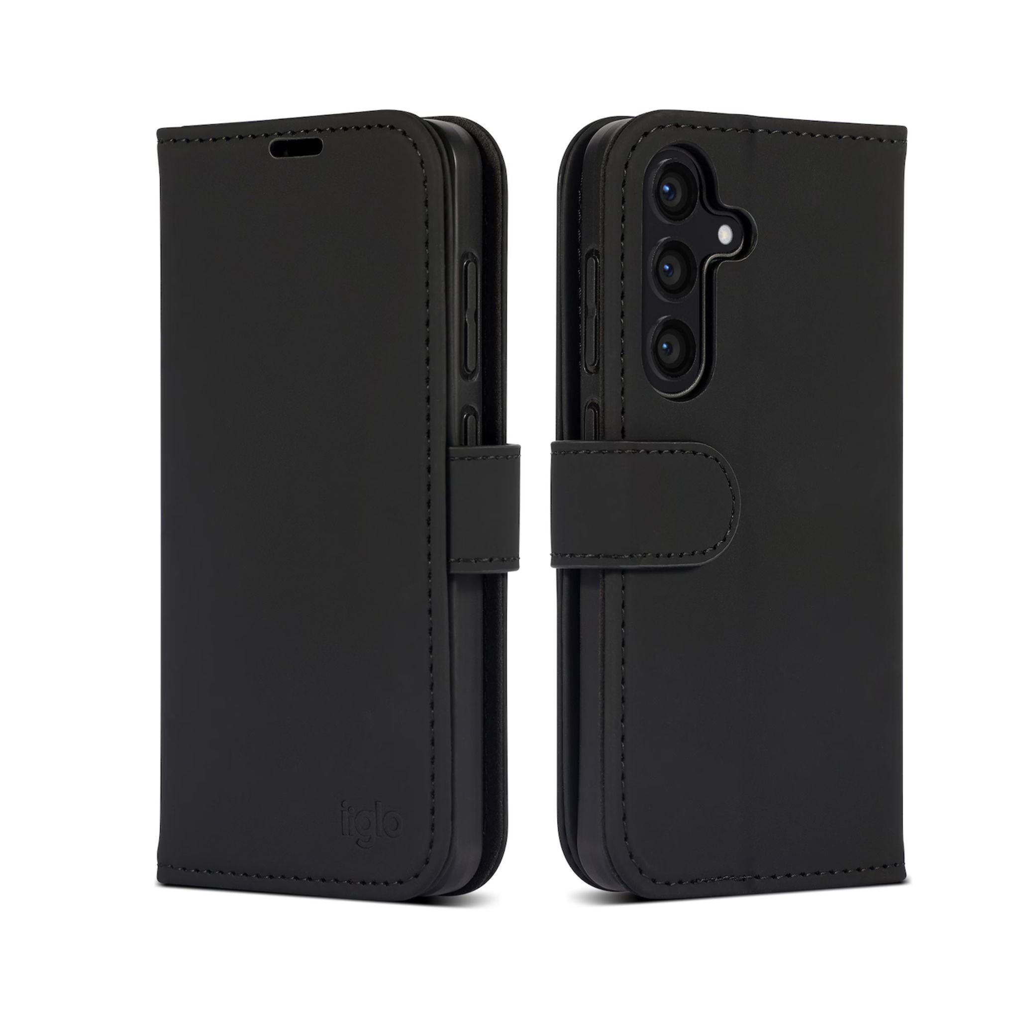 iiglo Galaxy S24 Lommebokdeksel Sort kombinerer stil, funksjonalitet og beskyttelse i ett. Laget av slitesterkt og mykt PU skinn, beskytter det telefonen din mot støt, riper og hverdagsslitasje, samtidig som det gir et moderne og elegant utseende.