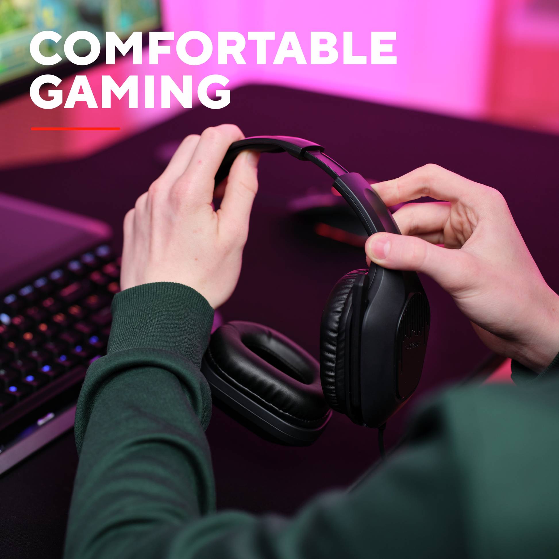 Den justerbare hodebøylen og myke øreputer i kunstskinn gir behagelig passform, selv under intense økter. Med en ekstra lang kabel på 2 meter og 3,5 mm tilkobling er headsettet enkelt å koble til både PC, konsoller og mobile enheter.